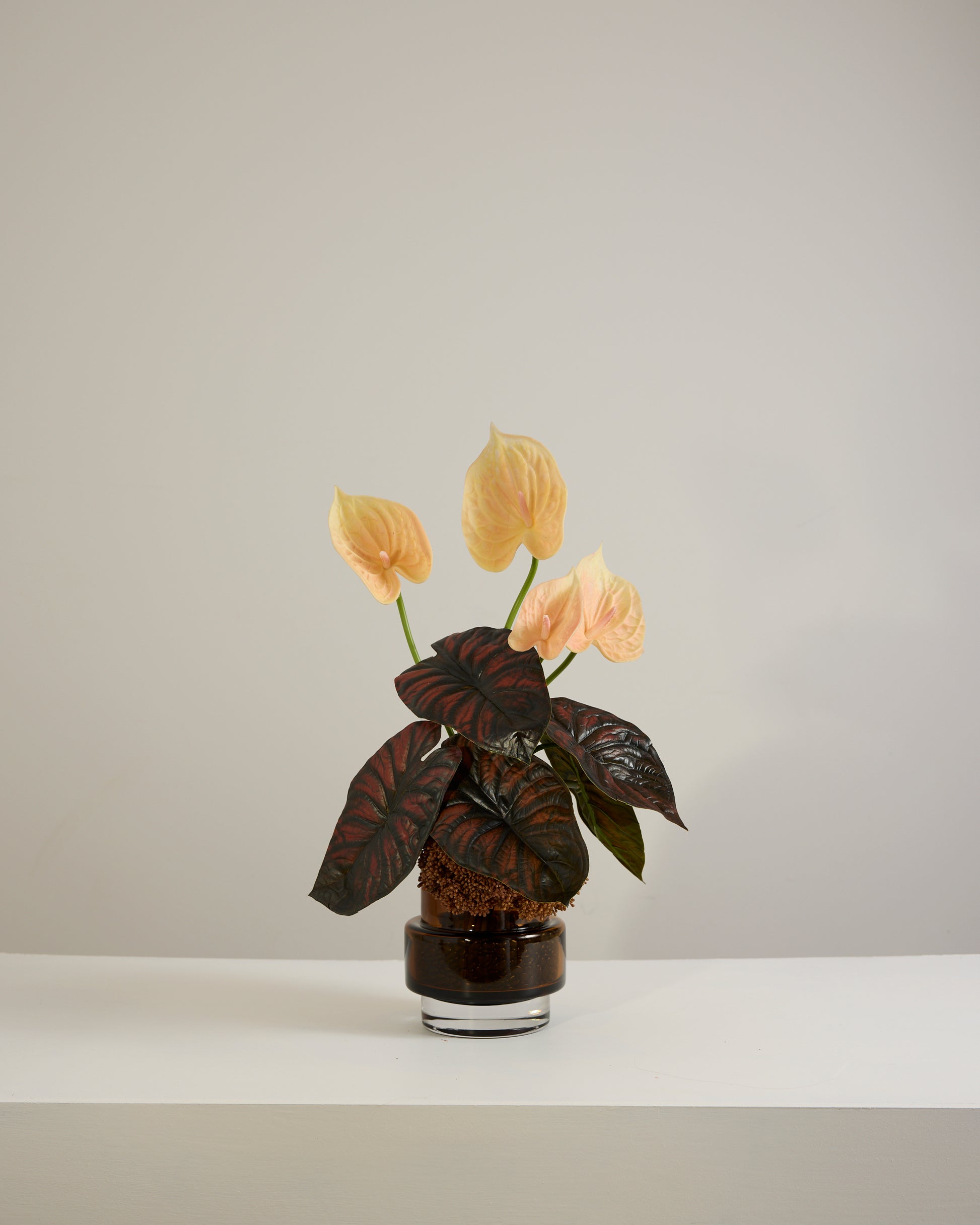 Sweet, stylish, and effortlessly chic, meet Cocoa, the small-but-mighty bouquet and vase set that proves good things really do come in smaller packages. Arranged in a rich chocolatey brown vase, this piece combines sculptural anthuriums with delicate berry detailing to create a look that’s warm, playful, and full of personality. The compact size makes it perfect for adding a touch of luxe to bedside tables, desks, shelves, or coffee corners, while the faux florals ensure it stays looking fresh forever.
