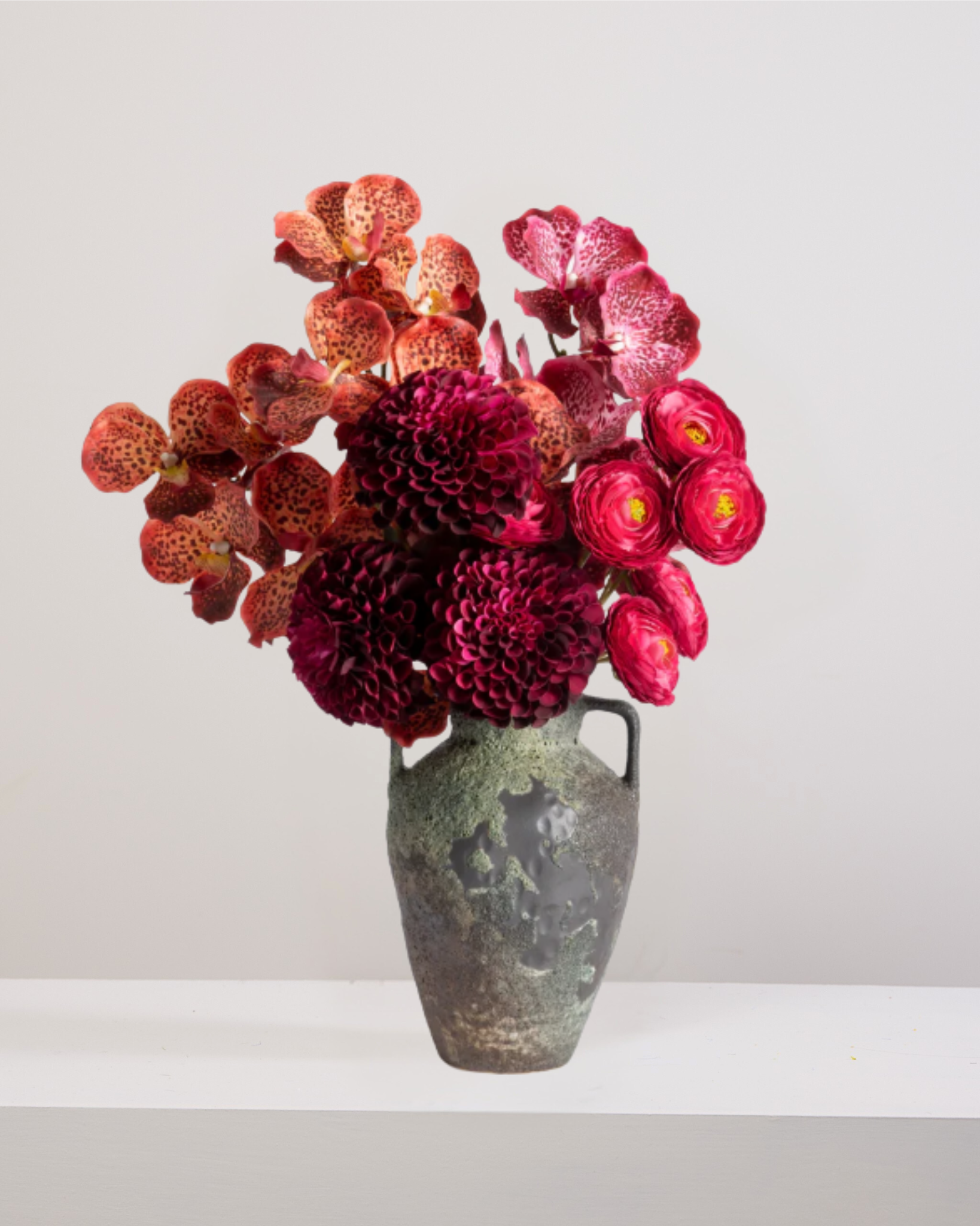 Meet Spicy Margarita, an unapologetically bold and playful faux floral arrangement that mixes sultry orchids, lush roses, and voluminous hydrangeas with show stopping texture and body. Featuring real-touch premium silk materials, every petal and stem mimics the beauty of fresh flowers—without the maintenance.