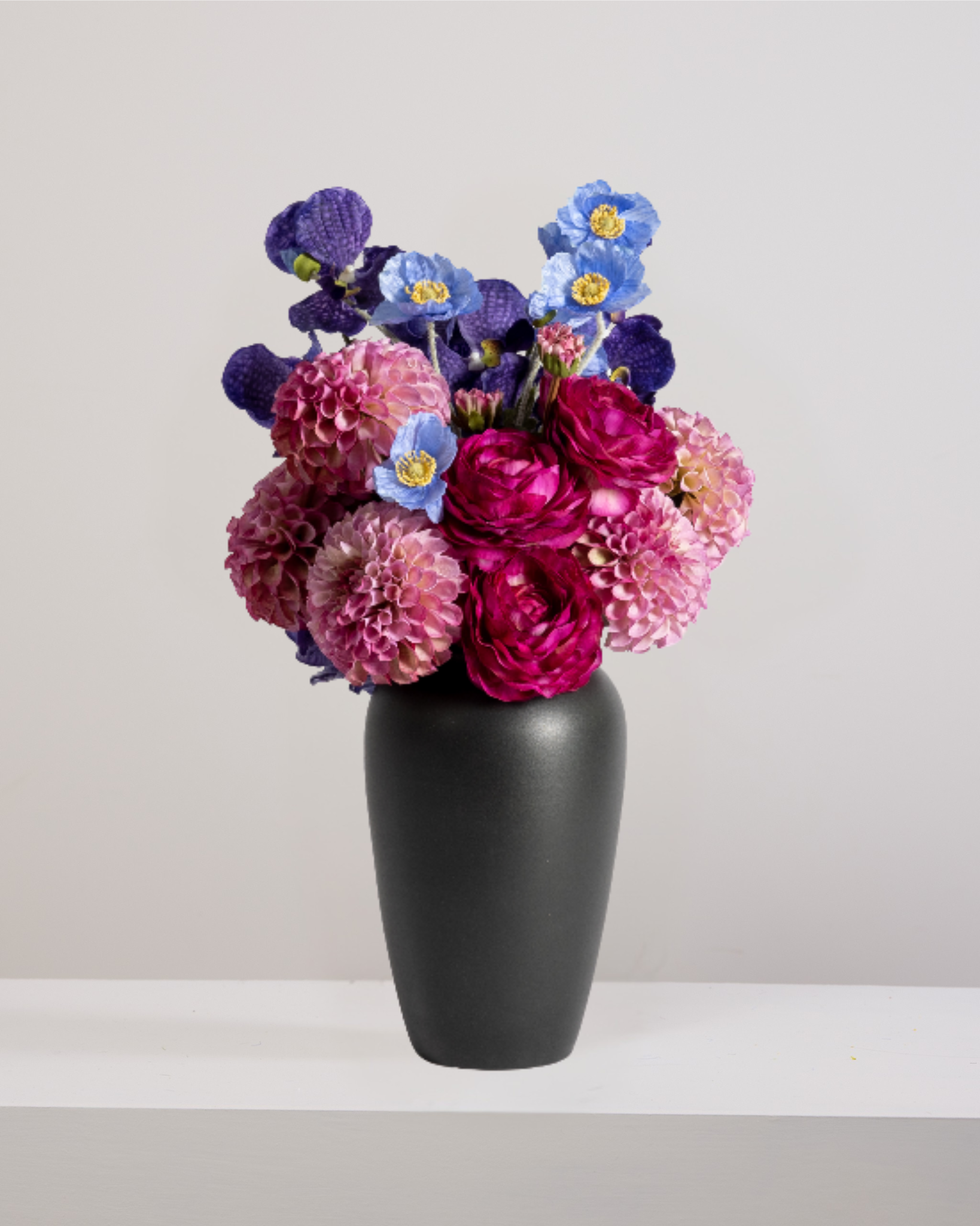 Eclectic Elegance: Pair with vintage-style furniture or deep-toned walls to bring out the richness of the pink, blue, and purple blooms. A black vase really brings out the florals richness and depth.